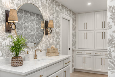 While the homeowner, who has a fantastic eye, chose the furnishings, we facilitated the completion of the upper-level punch list and layered in thoughtful design details. Highlights included wallpaper selections for the powder and cabana baths, custom fabrics and upholstery in the master suite, grasscloth on the entertainment wall in the great room, and sapphire glass shelving that elevated the bar area with a touch of sparkle.